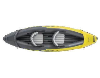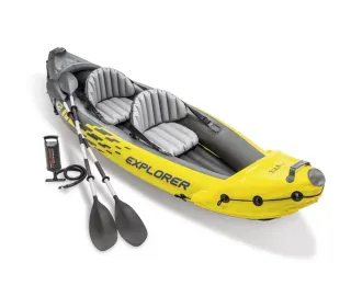 Kayak inflable Intex Explorer K2 en color amarillo. Ideal para aventuras acuáticas. - Diseño de dos plazas. - Incluye remos y bomba de inflado. - Material resistente y duradero.