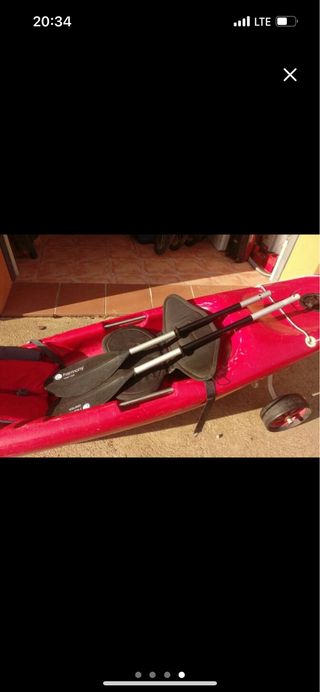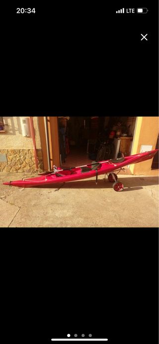 Kayak de dos plazas, con espacio adicional para un niño. Se encuentra en perfecto estado. - Diseño para dos adultos y un niño. - Color rojo y amarillo. mas 2 remos y un carro transporte