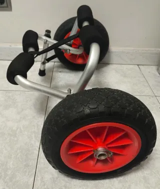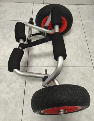 Carro de transporte para kayak con dos ruedas de goma. Maneja tu kayak, tabla paddle surf, piragua...con gran comodidad, facil de guardar. Más info preguntar. - Estructura de aluminio. - Ruedas resistentes - Soportes acolchados.