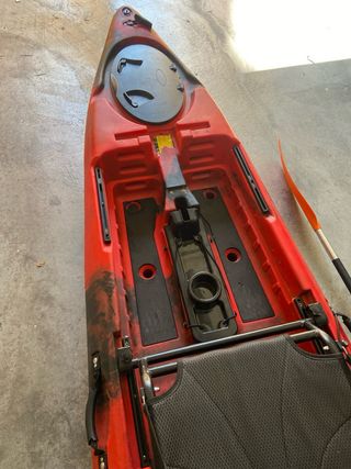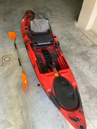 Se vende espectacular Kayak de pesca con asiento, remos y sistema de propulsión a pedales integrado. - Color naranja y negro. - Diseño para pesca.