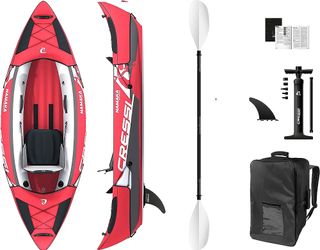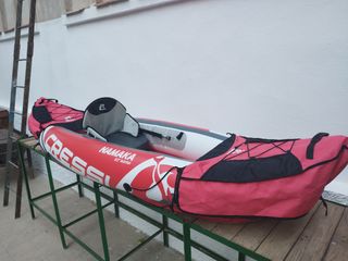 Kayak individual hinchable con un diseño moderno y llamativo. - Color verde, azul y gris. - Red de carga en la parte trasera. - Asiento inflable. - Válvulas de inflado y desinflado. - Aleta - 1 pala Solo usado un fin de semana el verano pasado 2025. Por problemas de salud, lo vendo. Ideal para rutas y ratos de tranquilidad Conservo su caja