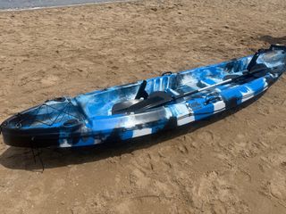 Kayak doble en perfecto estado, apenas usado, ideal para disfrutar en el agua. - Incluye 6 cañeros (2 giratorios y 4 fijos), 2 palas, 2 asientos. - Diseño camuflaje azul y negro.