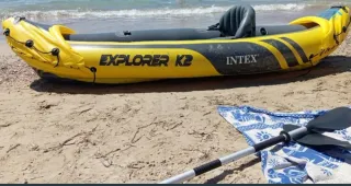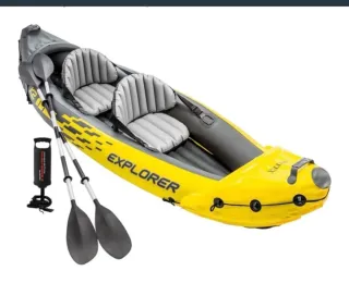Kayak inflable de dos plazas, modelo Explorer K2 de Intex. Perfecto para disfrutar del agua. Incluye 2 asientos, 2 remos dobles, inflador manual y bolsa de transporte. - Color amarillo y gris. - Ideal para excursiones en lagos o ríos tranquilos.