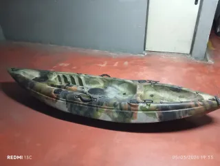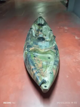Kayak de pesca con diseño de camuflaje. - Asientos moldeados para mayor comodidad. - Varios portacañas integrados. - Asas de transporte resistentes. Incluye chaleco y ruedas para trasportarlo Algún arañazo en los laterales del uso pero en buen estado Incluye dos remos