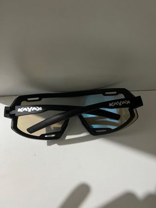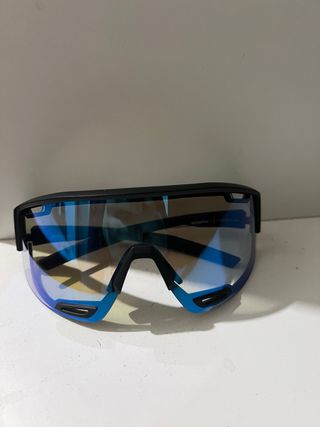 Gafas deportivas diseñadas para actividades acuáticas como el kayak. Ofrecen una protección completa y un ajuste seguro. - Lentes con acabado espejo azul. - Montura negra y detalles en azul. - Diseño envolvente para mayor cobertura.