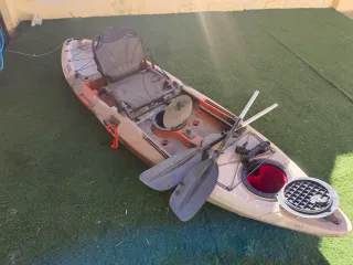 Kayak de pesca siempre endulzado y guardado en cochera. Asiento acolchado RTM. 3 cañeros fijos y otro giratorio RTM. (2 en popa modificados para que queden orientados hacia las bandas y otros dos en proa). Pala kayak desmontable. Tambucho de proa a rosca estanco. Quilla de proa se cambió y está completamente nueva. Sin golpes, rajas ni reparado. Sólo algunos arañazos y las pegatinas originales de casa raspadas. Pero nunca arrastrado en arena, siempre se ha llevado con ruedas hasta la playa.