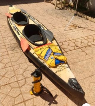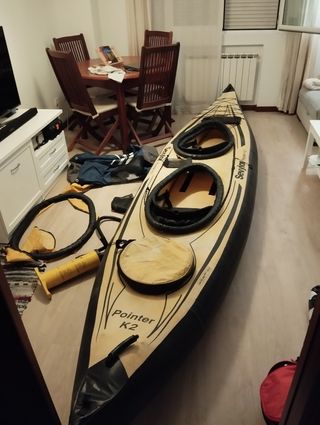Kayak inflable Sevylor Pointer 2 para dos personas. Prestaciones similares a un rígido.Precio nuevo 900€ *Hay que SUSTITUIR CAMARA lateral derecha.Asa trasera rota pero se puede utilizar. - Se entrega con una bomba de inflado. -2asientos. -2 cubrebañeras de 1 y 2 plazas. -3bosillos semirígidos tipo malla para llevar cosas. -Regalo bolsa Sevylor,habría que coser laterales.