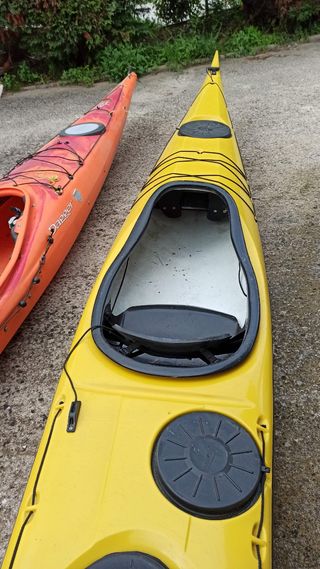Kayak de dos plazas para adultos y otra pequeña. Ligero y fuerte, pesa 29 kg y soporta hasta 220 kg. De plástico polietileno insumergible y autovaciable. Mide 370x88 cm. Auque sea usado aún le queda mucho uso. Equipado con dos asientos, ancla. No te incluye carro portador. - Asientos cómodos. - Diseño estable.