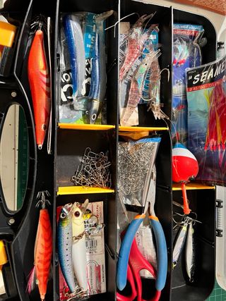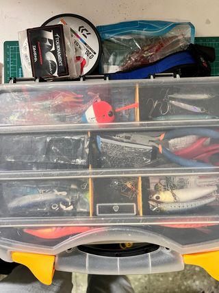 Organizador de pesca con una amplia selección de señuelos y accesorios. - Incluye señuelos de diferentes tipos y colores. Yozuri, Hart, Bony, Black Minnows, la mayoría comprados en Game Fisher BCN. - Contiene anzuelos y otros elementos esenciales para la pesca. - Caja de plástico transparente con compartimentos. Vendí el kayak con el que algunas veces había salido y ya no los uso, algunos ni tocaron el agua..