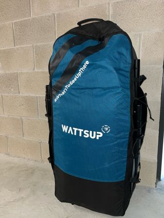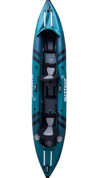 Kayak inflable Wattsup de dos plazas, perfecto para disfrutar del agua. - Modelo: COD - Dimensiones: 410 x 85 cm - Color: Azul y negro - Incluye bolsa de transporte. 2 aletas Kit de reparación 2 asientos 2 remos Bomba de inflado con manómetro