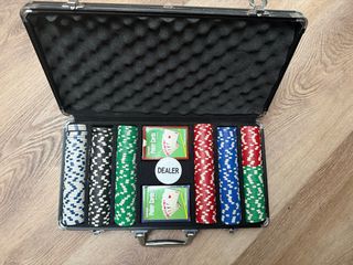 Maletín de póker clásico con interior acolchado y cierre metálico. Incluye 300 fichas de casino, ficha DEALER y dos barajas nuevas, sin uso (fotos), marca Jackpots. 🎲🃏✨ Ideal para partidas en casa, eventos o regalo. Las fichas tienen buen peso y tacto tipo casino. El maletín es resistente, con asa metálica y cierres firmes. 💼🔒 Todo en muy buen estado y listo para disfrutar. ♠️♥️ Keywords: póker, fichas, casino, barajas, dealer, maletín aluminio, juego mesa, set completo, cartas nuevas, Jackpots