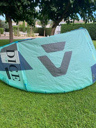 Cometa kitesurf Duotone Dice de 9 metros del año 2021. Diseño moderno y llamativo. Sin barra, cualquier barra de 4 líneas va bién. - Color principal verde menta. - Detalle de logo en gris oscuro. - Marca Duotone. - Modelo Dice Tiene un par de poros que no afectan para nada el vuelo o funcionamiento de la cometa. se puede ver y probar en girona Se vende por haber dejado de navegar. Precio bajo para quitar de encima rápido kitesurf kite cometa cabrinha north ozone duotone