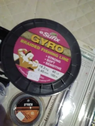 Compuesto - Bobina 1000mts línea trenzada Sufix Gyro de 0'40mm - Dos señuelos VMC de gran medida 20cms y 16cms - Dos bobinas de hilo acero Kali. - 2 paquetes enganche rapala 55kgs. - 1 cuenta metros Cormoran. - PRECIO en tienda sobre los 130€. *** SUPER PRECIO. Ya muy rebajado y final.