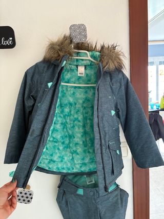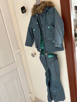 Conjunto de nieve de la marca Quechua, ideal para mantenerte abrigado y seco en tus aventuras invernales. Está en perfecto estado. - Chaqueta con capucha y pelo. - Pantalón de nieve. - Color azul verdoso con detalles en turquesa.