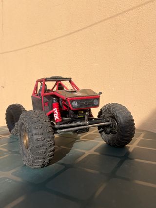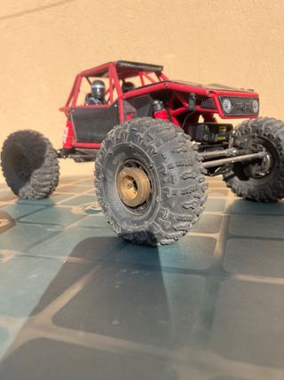 Vehículo a radiocontrol tipo rock crawler con un diseño deportivo en color rojo. - Neumáticos todoterreno de gran tamaño. - Suspensión independiente. - Chasis reforzado.