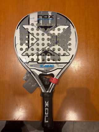 Pala de pádel Nox X-Hero con un diseño moderno y llamativo. - Pala de pádel Nox. - Modelo X-Hero. - Diseño en blanco, gris y negro.