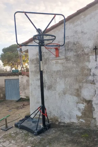 Canasta de baloncesto con base para rellenar con agua o arena. Tiene el tablero roto i la base de rellenar el agua rota pero se puede poner sacos de arena o algo de peso de ai su precio - Aro de baloncesto. - Estructura metálica. - Base de plástico negro.