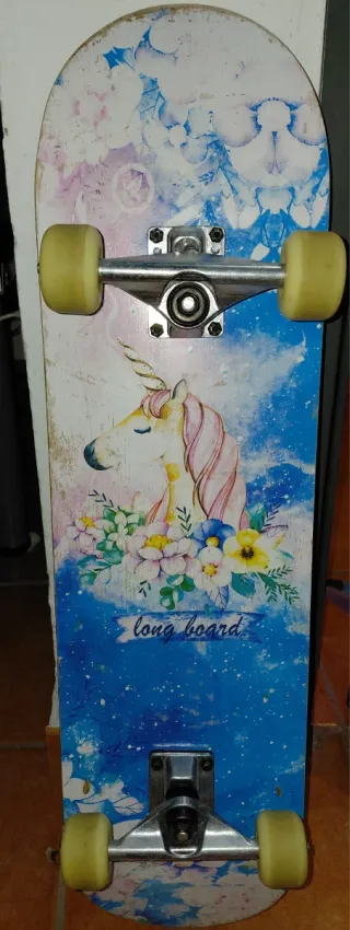 Longboard con un diseño único y llamativo de unicornio y flores. - Diseño de unicornio y flores. - Ruedas amarillas. Tiene muy poco uso