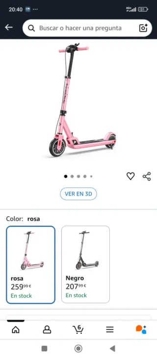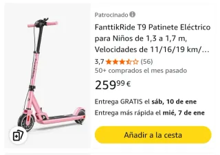 Patinete eléctrico rosa FanttikRide T9. - Diseñado para niños de 1,3 a 1,7 m. - Velocidades de 11, 16 y 19 km/h. - Valorado en 3,7 estrellas por 56 compradores. - Más de 50 comprados el mes pasado.