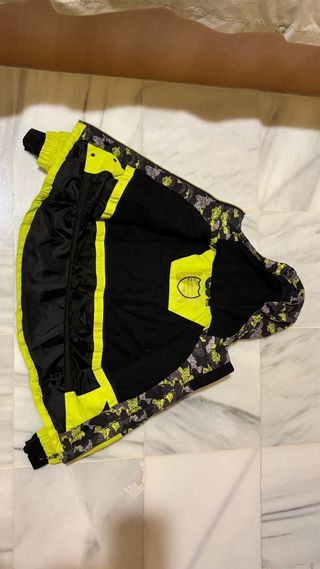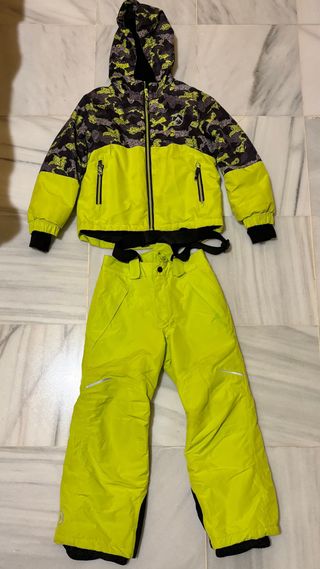 Conjunto de esquí para niños de 6 años, en excelente estado. - Chaqueta con capucha y estampado de camuflaje. - Pantalones de esquí en color amarillo neón. - Cremalleras frontales y en bolsillos. - Tirantes ajustables en los pantalones.