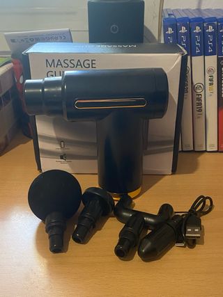 Pistola de masaje muscular en color negro, ideal para recuperación y relajación. - Diseño ergonómico. - Incluye varios cabezales de masaje. - Cable de carga USB.