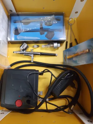 Kit de aerógrafo completo para diversas aplicaciones. Incluye un aerógrafo de doble acción, un pequeño compresor y varios accesorios para su mantenimiento y uso. - Aerógrafo de doble acción. - Compresor compacto. - Juego de cepillos de limpieza. - Adaptadores y manguera.