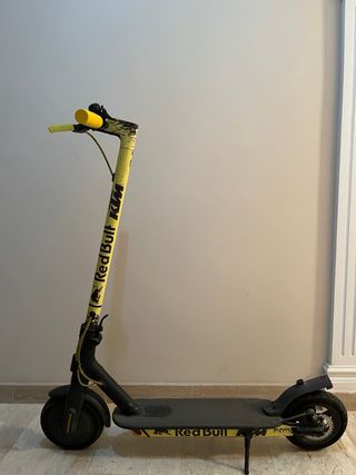 Se vende patinete eléctrico Xiaomi muy cuidado con diseño Red Bull KTM. También se incluye el amortiguador delantero. - Color amarillo - Detalles gráficos de Red Bull y KTM. - Manillar con puños amarillos.