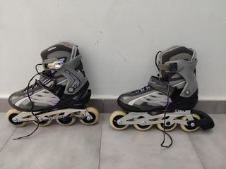 Par de patines en línea Oxelo en color gris y morado. - Cierre con cordones, velcro y hebilla. - Ruedas de poliuretano. - Botín acolchado para mayor comodidad.