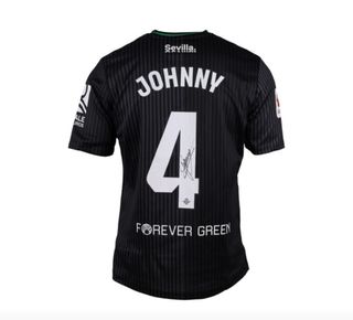 Camiseta de juego del Real Betis Balompié, dorsal número 4, de Jhoni Cardoso. Usada en el partido de las Palmas Betis en la temp 23-24 Cuenta con certificado de autenticidad de matchworn shirt y se entrega en su caja - Diseño a rayas verticales negras. - Nombre 'JOHNNY' y dorsal '4' en blanco. - Firma del jugador estampada. - Inscripción 'FOREVER GREEN'.