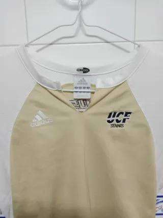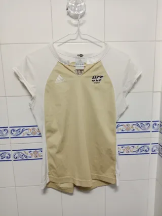Camiseta deportiva Adidas para mujer, ideal para tenis o pádel. - Diseño bicolor blanco y beige. - Logo de Adidas y UCF. - Tecnología ClimaCool.