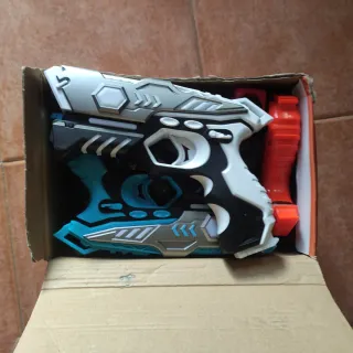 Set de cuatro pistolas de juguete con tecnología infrarroja y chalecos a juego. Nunca se han utilizado, se abrió la caja cuando se la regalaron para probarlas que funcionaban y se volvieron a guardar hasta hoy. - Pistolas con diseño futurista en colores plateado, negro y azul. - Incluye cuatro chalecos. - Ideal para juegos de equipo.