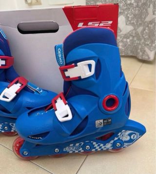 Set de patines en línea de color azul, perfectos para iniciarse en el patinaje. Incluye equipo de protección. - Patines de color azul con detalles en rojo y blanco. - Cierres de velcro y hebilla. - Ruedas rojas. - Incluye rodilleras, coderas y muñequeras de protección.