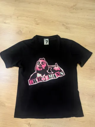 Camiseta negra unisex con estampado frontal de DR. HOFMANN en rosa. - Diseño llamativo con retrato y texto. - Talla S (talla algo grande) - Original