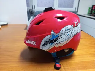 Casco de esquí Uvex para niño, talla 52-54 cm. Diseño en color rojo con detalles gráficos. - Marca: Uvex - Talla: 52-54 cm - Color: Rojo - Diseño: Estrellas y grafismos