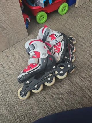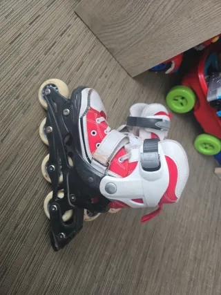 Patines en línea de la marca Topicnoisy, ideales para iniciarse en el patinaje. - Talla ajustable de 30 a 33. - Diseño en color blanco, rojo y negro. - Cierre de velcro y hebilla para un ajuste seguro. - Ruedas de poliuretano. - Lo compré para piezas.