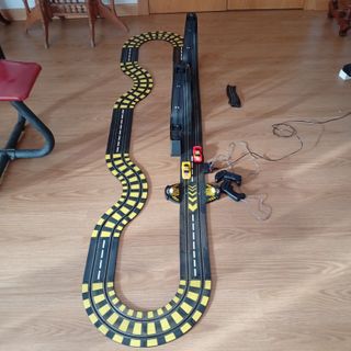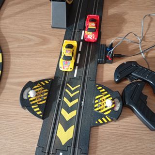 Circuito de coches Scalextric Road Racing con dos pistas de loop. Como se aprecia en las fotos, los coches funcionan, y enciende la luz, pero no engranan para rodar. Quizá sea un problema sencillo de solucionar. Como no entiendo, de ahí el precio. - Incluye dos coches. - Mando de control.