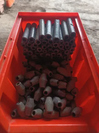 Lote de plomos para redes de pesca. Son de color gris oscuro y tienen forma cilíndrica y ovalada. - Plomos cilíndricos de 6cms de largo y 1'5cms de ancho. (50 gramos) - Plomos ovalados de 3cms de largo y 1'8cms de ancho. (30 gramos) -Ambos con agujero de 8 mm - 0'50 € cilíndrico - 0'30 € ovalado