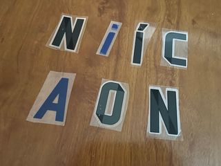 Serigrafía para camiseta del Real Madrid. - Incluye nombre 'AYON'. - Incluye dorsal '14'. - Escudo del Real Madrid. - Incluye otras letras sueltas y números.