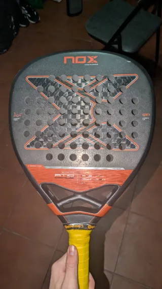 Pala de pádel Nox AT10 12K Attack, modelo 2025. Una pala que considero polivalente tiene poco uso 5 o 6 partidos solo tiene los roces del borde, las caras están impecables y está como nueva. Precio no negociable. PRECIO NEGOCIABLE - Acabado en negro y naranja. - Superficie con puntos de relieve para mayor efecto.