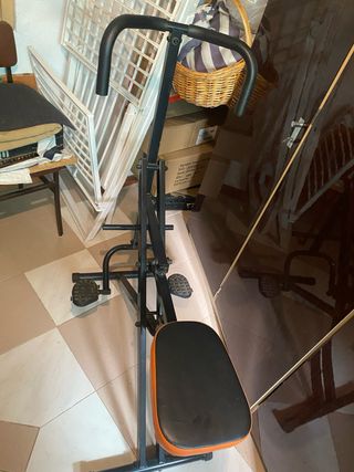 Equipo de gimnasio versátil para entrenamientos en casa. - Estructura metálica robusta. - Asiento acolchado. - Barras de agarre con recubrimiento. - Cadena y barra de accesorio incluidas.