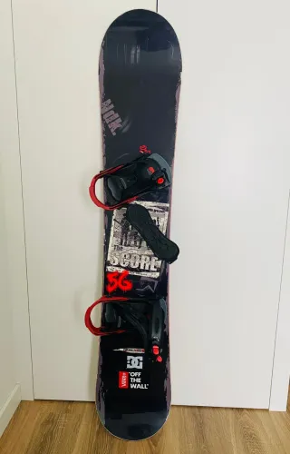Tabla de snowboard con fijaciones incluidas. 154 cm de largo y 25 de ancho. - Diseño gráfico The Score. - Fijaciones negras y rojas. - Incluye funda para transporte.