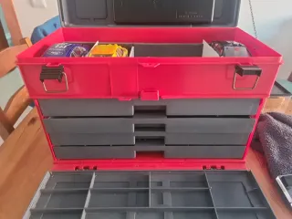 Maleta de transporte para coches de slot a escala 1/24. Incluye tres coches. - Maleta roja con compartimentos. - Coche Ford Focus RS azul. - Coche Ford Escort amarillo con detalles naranjas. - Coche Peugeot 206 blanco y gris con dorsal 3. - Incluye algo de recambio Scalextric ninco exin rally slot tyco carrera superslot