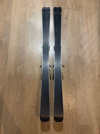 Esquís de la marca Salomon con fijaciones incluidas. Listos para la nieve. - Fijaciones Salomon. - Ajuste de talla visible en la fijación.