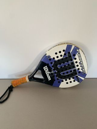 Pala de pádel Wilson con un diseño llamativo en blanco, morado y negro. - Superficie con agujeros. - Mango con grip naranja y cordón de seguridad negro. - Logo de Wilson en la pala y en el grip.