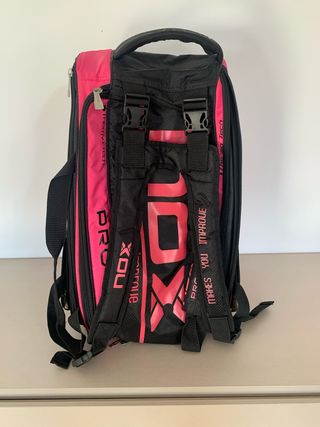 Paletero de pádel de la marca NOX, modelo PRO. - Color negro con detalles en rosa. - Diseño moderno y funcional. - Compartimentos amplios para equipamiento deportivo.