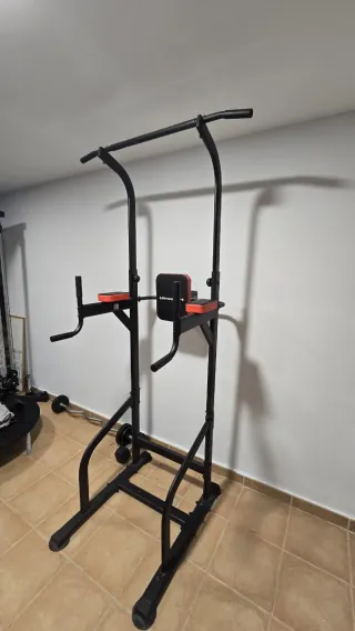 Torre de entrenamiento para ejercicios en casa. - Barra de dominadas. - Agarres para fondos y elevaciones. - Respaldo acolchado.