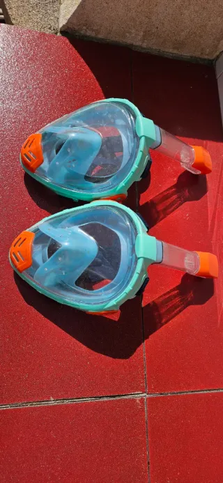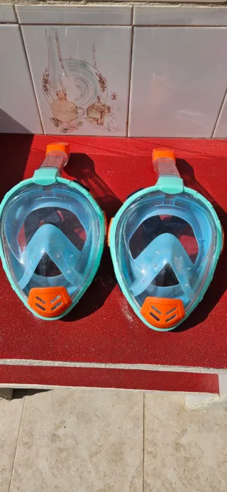 Se venden dos máscaras de snorkel de cara completa - Color azul y naranja. - Diseño integral para respirar cómodamente.