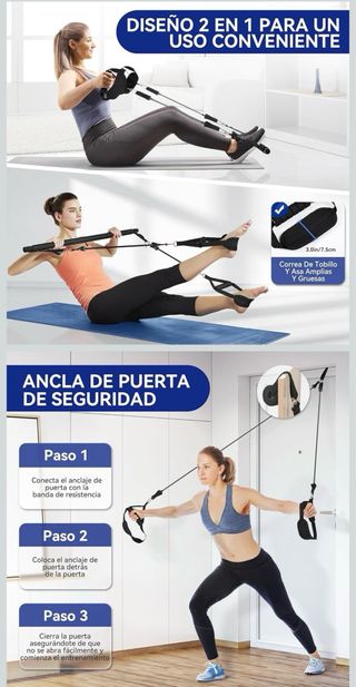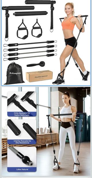 Kit de Pilates completo para entrenar en casa o al aire libre. Incluye barra desmontable y bandas de resistencia. - Barra de Pilates desmontable en dos partes. - Bandas de resistencia de látex natural. - Asas de espuma para mayor comodidad. - Correa ajustable de nailon reforzado. - Bolsa de transporte incluida.