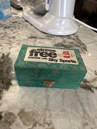 Elegante caja decorativa con temática de fútbol y Sky Sports. - Diseño Stress Free Soccer. - Acabado en tela verde con motivos. - Cierre metálico dorado.
