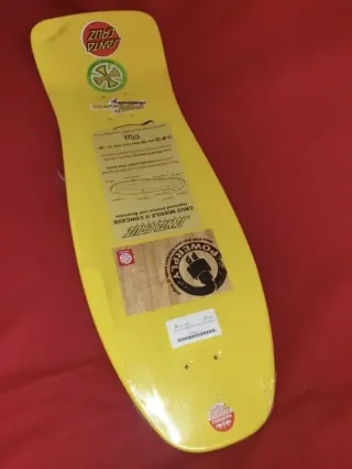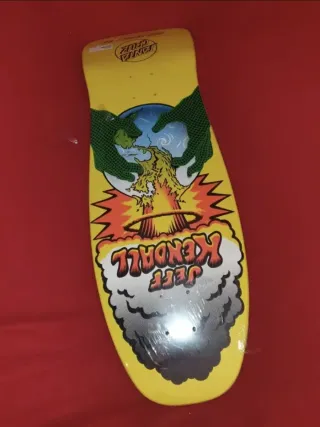 Tabla de skate Santa Cruz con diseño de Jeff Kendall. El fondo es de color amarillo vibrante. - Gráfico de Jeff Kendall. - Marca Santa Cruz. - Color amarillo.